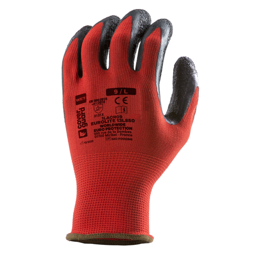 Tricot rouge sans couture à base de polyester, jauge 13, Enduction palmaire en latex noir avec finition adhérisée de la paume, Poignet tricot