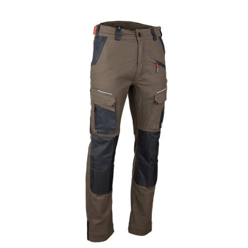 Fermeture bouton clou et braguette zippée Ceinture resserrable sur les côtés par patte avec élastique contrastant 4 passants + un large milieu dos Ceinture réhaussée dans le dos Poche main ouverture renforcée et poche ticket en Oxford Poche zippée insérée dans découpe en biais devant Attache porte marteau 2 poches dos semi flottantes dont une avec rabat 1 grande poche cuisse à rabat et soufflet avec petites poches appliquées en Oxford et insertion de passepoil rétro-réfléchissant perforé [...]