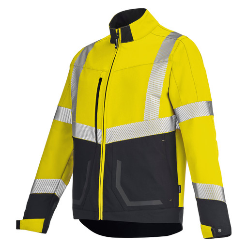Col montant contrasté avec mentonnière. Devant fermé par fermeture à glissière sous double lèvres. Poche poitrine fermée par fermeture à glissière. Poche intérieure plaquée fermée par auto-agrippant. Poches basses fermées par fermeture à glissière et soulignées avec bande effet mat. Bandes rétro-réfléchissantes thermocollées de 50mm. Découpe dos. Ceinture dépassante. Bas de manches fermés par grippers. Tissu fluo : 94% polyester recyclé 6% élasthanne - 280 g/m². Tissu contraste : [...]