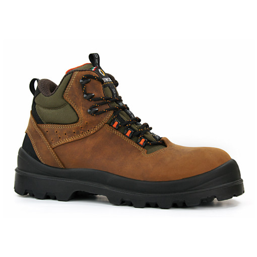 Chaussure de sécurité haute en cuir gras pleine fleur hydrofuge couleur marron, sans couture latérale, entièrement doublée avec doublure HK3 indémaillable, résistante, résiliente et très respirante. Haut de col matelassé textile hydrofuge. Laçage sur anneaux plastifiés Clip Cool. Soufflet matelassé et hydrofuge empêchant les corps étrangers de pénétrer. Semelle de confort Unisoft anatomique avec absorbeur de choc au talon, antistatique et traitée anti-bactéries. Embout synthétique Unic [...]