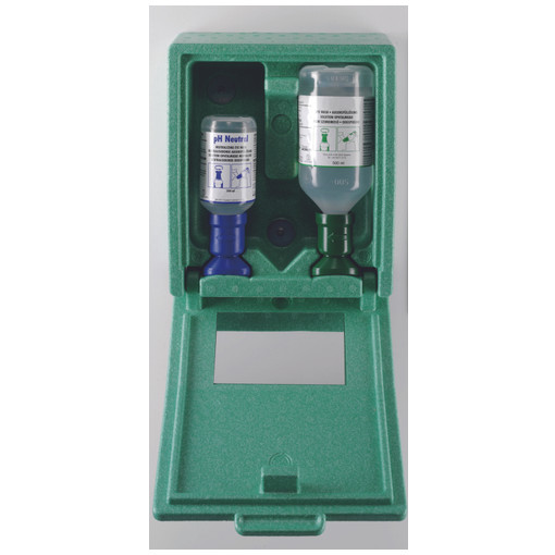 Convient pour un lavage des yeux en cas de projections d'acides ou de bases composition : - 1 lave œil 200 ml de solution PH neutre - 1 lave œil 500 ml de solution ophtalmique stérile(0,9 % de NaCI) - 1 support mural avec miroir la solution PH neutre neutralise les projections de solutions alcalines bases ou acides, stoppe les brulures et ramène le niveau de PH dans l'œil à 7,4 en moins de 20 secondes le sérum physiologique permet de rincer l'œil après utilisation du PH, température de conservat [...]