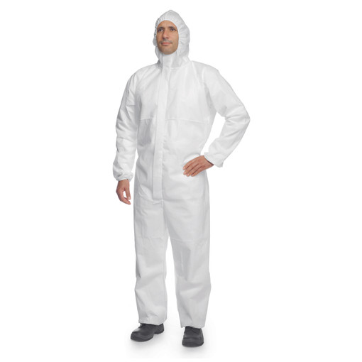 Combinaison en SMS avec capuche élastiquée en 2 parties, élastiques poignets, taille et chevilles, fermeture à glissière sous rabat adhésif.
