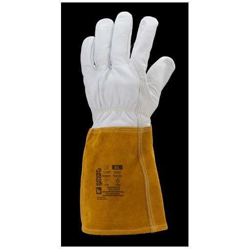 Cuir supérieur pleine fleur de caprin, coutures para-aramide, pouce palmé, élastique de serrage au dos de la main, manchette de sécurité en croûte orange, longueur : 15cm.