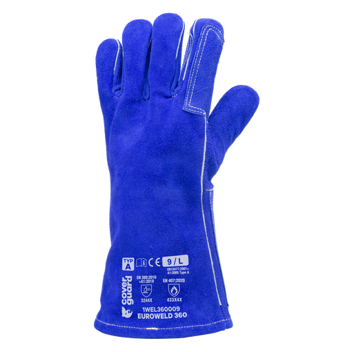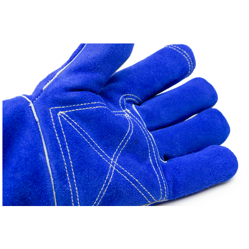 Croûte de vachette bleue, coutures Kevlar, Pouce palmé, Intérieur molletonné, Renfort paume en cuir bleu, protège artère, Manchette de sécurité en cuir croûte, longueur : 15 cm.