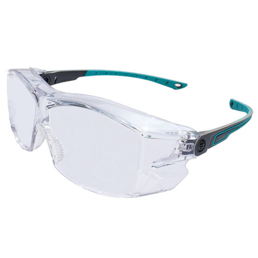 Sur-lunettes confortable et légère avec un design sportif, des branches souples réglables pivotantes, des verres clairs, un pont de nez réglable.